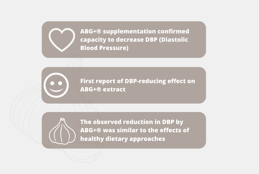 Six-week results demonstrated that ABG+® extract significantly reduced diastolic blood pressure (DBP) by 5.85mm Hg on average compared to the placebo. The positive reaction was particularly evident in men.